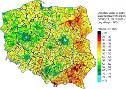 As of January 18, 2022, Poland's vaccination rate was only 56%, below the EU average of 69%. In 2020, one third of Poles aged 18–65 had stated in a study that they would never want to be vaccinated against COVID-19, more so in rural areas with a high representation of the ruling PIS party.[73]