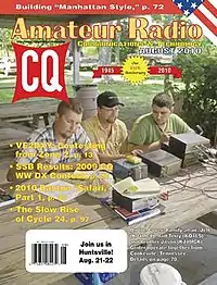 CQ Amateur Radio (also known simply as CQ or CQ magazine, and formerly as CQ: The Radio Amateur's Journal) is a magazine for amateur radio enthusiasts first published in 1945.[2] The English language edition is read worldwide; Spanish language edition is published in Spain, with some translations of articles from the English language edition, and some original European content. The magazine was also published in France with partial translation of the original edition between 1995–2000 (ISSN 1267-2750). Published by CQ Communications, the title is based on the radio call "CQ".[3]