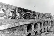The third span was incorporated into the pillars of the Puente de la Calzada railway bridge when it was constructed in 1930, and was uncovered when the bridge was dismantled in 1991.[6] Somewhat surprisingly, this section of the aqueduct is actually the best preserved. Upon its rediscovery, a niche which had previously contained an image of the Virgin Mary, known as the Virgin of las Madejas, was revealed. The previous image, which had been venerated for centuries, was transferred to the Church of San Roque in 1869 after it was attacked by revolutionaries, and it was burned and lapidate by Republicans in 1936 during the Spanish Civil War.[7] An azulejo reproduction produced by Juan Aragón Cuesta in 1993 now occupies its place.[8]