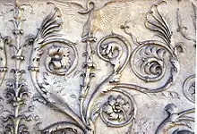 Augustus was granted the right to hang the corona civica (civic crown) above his door and to have laurels drape his doorposts.[133] However, he renounced flaunting insignia of power such as holding a scepter, wearing a diadem, or wearing the golden crown and purple toga of his predecessor Julius Caesar.[151] If he refused to symbolize his power by donning and bearing these items on his person, the Senate nonetheless awarded him with a golden shield displayed in the meeting hall of the Curia, bearing the inscription virtus, pietas, clementia, iustitia—"valor, piety, clemency, and justice."[133][152]