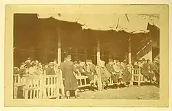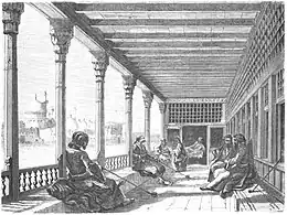 Cafés started to spread around the city and its outskirts. The number of cafes in Baghdad reached 184, according to what was indicated by the Baghdad Code of 1882, and by 1903, the number had reached 285.[8] This increase called for competition between café owners to win the largest number of customers, some owners turned to discotheques for the competition. What helped in this matter was the declaration of the Ottoman constitution in 1908 about giving relative freedoms to the religious and national communities of the states that were under the control of the Ottomans, and many of the restrictions imposed on the press were lifted.[6] Café competitors hired well-known Iraqi singers to play Iraqi maqam and reciters to attract customers as well as storytellers and actors that put on fantasy shows. Although some cafés developed their own performances notably those around al-Maidan Square. Some owners went as far as hiring female dancers and singers from Egypt, and the Levant, and this recruitment was considered a shift in public social morals at the time. Some owners even changed the buildings' structures for a stage to be built. Cafés also started to become crowded during the evening nights of Ramadan and games were played such as those that involved zurkhāneh.[7][9]