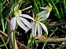Caladenia prolata, commonly known as long-leaf fingers[2] or white fingers[3] is a plant in the orchid family Orchidaceae and is endemic to southern Australia. It is a ground orchid with a single leaf and one or two dull white flowers which are greenish with red stripes on the back.