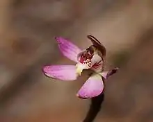 Caladenia pusilla, commonly known as tiny fingers,[2] pygmy caladenia,[3] tiny caladenia[4] or pink fingers,[5] is a plant in the orchid family Orchidaceae and is native to Australia and New Zealand. It is a ground orchid with a single erect, sparsely hairy leaf and a single pink flower with a brownish-pink back. The flowers are short-lived and self-pollinating.