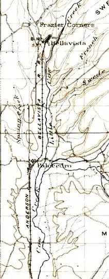 The roots of this operation date back to 1884 when the Morris brothers began construction of a flume from the rich timber belt near Round Mountain about 35 miles (56 km) northeast of Redding on the Little Cow Creek drainage to a point below the snow belt. From here, sawn boards were transported by wagons to the railhead. Ownership passed to Joseph Enright of Chico, who extended the flume (up to 32 miles (51 km)) to a planing mill, drying shed, and box factory he erected where Little Cow Creek and Dry Creek join to form Cow Creek. The community around the operation became known as Bella Vista.