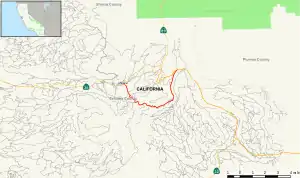 Except where prefixed with a letter, postmiles were measured on the road as it was in 1964, based on the alignment that existed at the time, and do not necessarily reflect current mileage. R reflects a realignment in the route since then, M indicates a second realignment, L refers to an overlap due to a correction or change, and T indicates postmiles classified as temporary (for a full list of prefixes, see California postmile § Official postmile definitions).[1] Segments that remain unconstructed or have been relinquished to local control may be omitted. The entire route is in Tehama County.