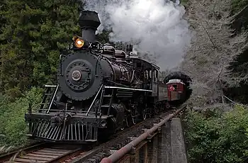 ![]() No. 45, seen here at the water tower in Fort Bragg, California (c. 1976), prepares to depart for Willits with the "Super Skunk" | |||||||||||||||||||||||||||||||||||||||||