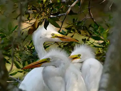 Well established rookeries are found on two of the island's lagoons, where black-crowned night-herons, great egrets, and great blue herons nest and raise their young. Osprey and bald eagles also nest on the island; and although there is not a wood stork rookery on Callawassie Island, significant numbers of this formerly endangered species have made the island their home. Other bird species known to frequent the island include: doves (Zenaidura carolinensis), quail (Colinus virginianus), crows (Corvus sp.), and vultures (Carthes aura). Marshes provide a habitat for marine oriented species including terns, gulls, sandpipers ), loons and ibis.[2]