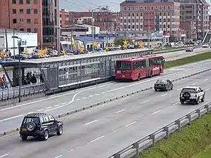 The simple station Calle 127 is part of the TransMilenio mass-transit system of Bogotá, Colombia, which opened in the year 2000.