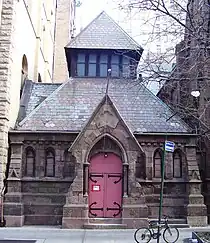 The church complex also includes the nine-story Calvary House, east of the church on Gramercy Park North (East 21st Street), also designed by Renwick, and built in 1867,[6][7] and the "Renwick Gem" Schoolhouse, a small building to the north of the church which was built as a theatre but used for that purpose only for a short time before being utilized for the Calvary Church Sunday school. It has a large interior space, about 27 feet (8.2 m) between the columns, which were designed to hold up the heavy slate roof without the use of exterior buttresses. The building, which as of 2011 houses the 4th and 5th grade classes of the École Internationale de New York, compensates for the shadowing of the taller buildings around through Renwick's use of 42 clerestory windows.[8]