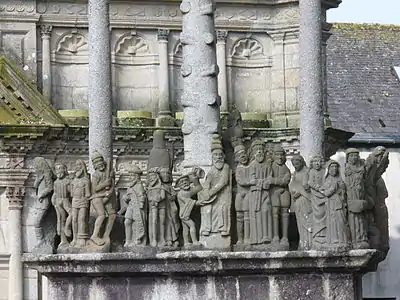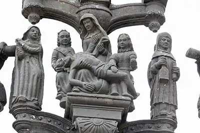 Apart from Roland Doré's "Christ aux outrages", and the crucifixion cross attributed to Yann Larhantec, the sculptural work on this calvary has been attributed to the Maître de Saint-Thégonnec's workshop, who are also credited with work on the calvary of the St Sébastien Chapel at Saint-Ségal and another at Locquénolé near Morlaix.[1] In 1794, during the course of the French revolution, the calvary was knocked down but the local people managed to save the sculptures and hide them away, although some were lost.[1] The calvary was the subject of a major restoration in 1970 by the organization Mainponte de Paris. The scenes depicted on the calvary relate to Jesus Christ's passion, his death and his resurrection and, in addition, there is a statue of St Thégonnec himself complete with the depiction of a wolf.[lower-alpha 1][1][2][3]
