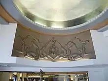 It was designed by Wimperis, Simpson and Guthrie; interior partly by Serge Chermayeff, with interior bronze friezes by sculptor Anthony Gibbons Grinling.[2] The theatre is built in steel and concrete and is known for its elegant and clean lines of design. The theatre was refurbished in 1950—the original gold and silver décor was painted over in red, and candelabras and chandeliers were added. In 1987, to restore the original décor, the theatre was once again refurbished, this time by Carl Toms. The theatre has a circular entrance foyer, with Grinling's bronze frieze depicting nude figures in exercise poses, the theme continues into the main foyer, with dancing nudes, marble pilaster up lighters and concealed lighting.[2]