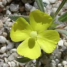 Camissoniopsis pallida is a low growing, yellow-flowered annual plant in the evening primrose family, Onagraceae.[2]: 238 It is known by the common names pale primrose[2]: 238 or pale yellow suncup. It is native to the desert and scrub habitat of the region where Arizona, California, and Nevada meet. It is a roughly hairy annual herb growing in a low patch on the ground, sometimes producing an erect stem from the basal rosette. The herbage is gray-green to reddish green. The leaves are lance-shaped and up to 3 centimeters long. The nodding inflorescence produces flowers with yellow petals 2 to 13 millimeters long, each with small red markings near the bases. The fruit is a straight to tightly coiled capsule.