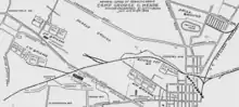 Planned as "Camp Lawton",[2] quartermasters erected the installation's buildings by July 2, 1902, which included headquarters at The Angle, the National Guard commissary along the Round Top Branch, the telegraph and telephone office at the "junction of the steam and electric roads near the Codori buildings", the Governor's Troop between the Hagerstown road and Chambersburg pike, and U.S. Army troops camped near the Reynolds equestrian statue[2] on McPherson Ridge. On July 11 Fort Myer's United States Cavalry and Artillery arrived to camp at Reynolds Avenue on McPherson Ridge.[1][3] By October 1914 the commissary—which was used as an arsenal between encampments—had been razed,[4] in 1917 the Gettysburg Electric Railway tracks were removed, c. 1942 the Round Top Branch was removed, and in 2011 the fencing of the Field of Pickett's Charge was restored.