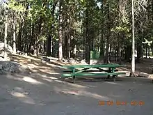 After Hog Ranch was purchased by the city, it was transformed into a lumber mill and railway station to support the construction of O'Shaughnessy Dam. The Hetch Hetchy Railroad reached the site in late 1917.[2] The rail ran east–west through the camp and a branch line of the California Peach and Fig Growers Railroad ran to the south where lumber was harvested for packing boxes.[3] A large pit was dug for gravel:[4] it later filled in naturally to form Birch Lake.[5]