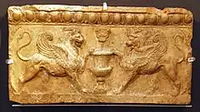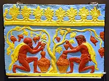 Nearly all Campana reliefs are from Central Italy, especially Latium. The largest and most important workshops seem to have been in Latium, especially in the neighbourhood of the city of Rome. Outside Latium the tiles are found mostly in Campania and in the former Etruscan sphere. At the end of the 1990s Marion Rauch compiled the reliefs with Dionysiac-Bacchic themes and was able to confirm this range for the motifs she was investigating. Nile scenes[6] are found only in Latium. No pieces have been found in the Greek areas of southern Italy or in Sicily.[7] An example from the Akademisches Kunstmuseum in Bonn, showing a Nike killing a bull was allegedly found in Agia Triada in Greece.[8] Some stuccoed examples derive from the western part of the Roman empire, the ancient regions of Hispania and Gaul (modern Spain and France).[9]