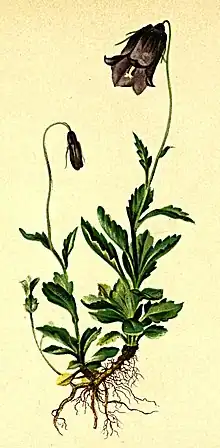 Campanula pulla, the solitary harebell, is a species of flowering plant in the family Campanulaceae, native to the northeastern Alps of Austria.[1] [2] A spreading, mat-forming perennial, the Royal Horticultural Society recommends it for scree gardens.[3] It is available from commercial suppliers.[4] There appear to be cultivars or selections; 'Blue Drops' and 'Alba',[5][6] and a hybrid with Campanula carpatica; Campanula × pulloides, which itself has cultivars, 'Jelly Bells', and 'G.F. Wilson', which has gained the RHS Award of Garden Merit.[7][8][9]