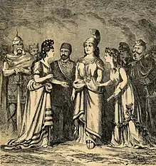 A political cartoon from 1871 depicting "Canada" holding hands with "Britannia" as Canada makes her debut to the "council of nations"