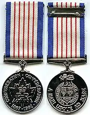 The 125th Anniversary of the Confederation of Canada Medal (French: Médaille commémorative du 125e anniversaire de la Confédération du Canada) is a commemorative medal struck by the Royal Canadian Mint to commemorate the 125th anniversary of the Confederation of Canada and was awarded to Canadians who were deemed to have made a significant contribution to their fellow citizens, to their community, or to Canada. Nominations were submitted to lieutenant governors and territorial commissioners, senators, members of parliament, provincial governments, the Public Service Commission of Canada, the Canadian Forces, the Royal Canadian Mounted Police,[2] and various federal government departments, as well as organizations throughout the country, and some 42,000 medals were awarded.[1]