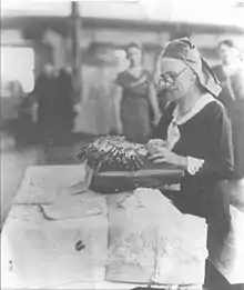 The guild set up a reference library in 1909.[2] That year Alice Peck proposed that the Guild should start a permanent collection holding some of the best handwork. The guild sold handicrafts at its shop and through agencies. It awarded prizes at annual competitions and ran educational programs, including classes for immigrant children and a weaving school.[7] By 1911 the Guild was very active across Canada and abroad. From 1905 to 1935 the guild exhibited the work of the First Nations at what is now the Montreal Museum of Fine Arts.[2] In the 1930s the guild opened branch offices in each province.[2] The Manitoba branch was formed in January 1928 by a group of over 30 women at a meeting in Winnipeg, led by Lady Constance Nanton.[8][lower-alpha 2] The organization became interested in education, and as the shop grew they also placed more emphasis on quality of design and workmanship.[8]