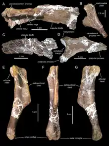Appendicular bones of Canardia. Left Scapula in lateral view (A). Left sternal plate in ventrolateral view (B). Distal blade of left scapula in lateral view (C). Fragmentary right pubis in lateral view (D). Left humerus in medial (E), rostral (F), and lateral (G) views.[1]