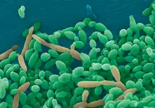 C. tropicalis reproduces asexually by the production of blastoconidia through budding. As blastoconidia increase in number they may elongate in shape producing structures called the pseudohyphae.[3][4] Under specific conditions of reduced oxygen level in host tissues, submerged colonies in agar medium, or in the presence of 5-10% CO2, true, septate hyphae may form.[9][3]