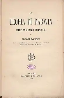 Canestrini made contributions in several biological disciplines, performing important research in the field of acarology. He was an advocate of Darwinism, and was responsible for translating Darwin's works. In 1864, he was the first to translate Darwin's On the Origin of Species into Italian.[1] Through these translations, Canestrini was a principal factor concerning the popularity of Darwinism in 19th century Italy. He wrote Origine dell’uomo (The Origin of Man, 1866) which advocated common ancestry and defended Darwin from criticisms of Giovanni Giuseppe Bianconi and others, this work was published five years before Darwin's The Descent of Man.[2] However, although Canestrini was a supporter of many of Darwin's ideas, he rejected his theories of pangenesis and sexual selection.[2]