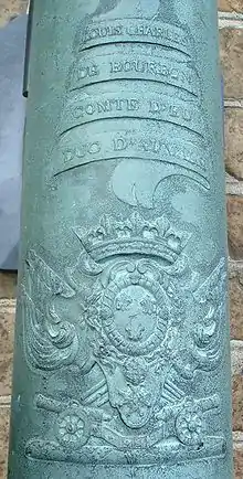 Starting with the front part, the gun had a sight design at it extremity. Then followed the name of the gun (here Le Tonnerre). Then, a Latin phrase "Ultima Ratio Regum", initially introduced by Louis XIV, and a rather thorough description of the role of the gun: "The Last Argument of Kings". Under that appears the name "Louis Charles de Bourbon, comte d'Eu, duc d'Aumale", the Grand Maître de l'artillerie de France (Grand Master of the Artillery of France), followed by a royal emblem. In the middle of the cannon are trunnions, used to position the gun in place and elevate or depress it. On top of the trunnions are dolphin-shaped ornaments, which are used in lifting the gun.[2]