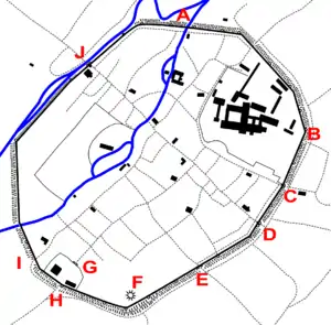 Wooden "bars" had been placed outside many of the city gates to regulate the flow of traffic by the 12th century, including Riding Gate, Worth Gate and North Gate.[38] One area of the city beyond the wall, called the baggeberi, may also have been protected by its own earthworks during the middle of the 12th century.[39] Canterbury was divided into wards by the 12th century, although these may potentially have been created as early as the Anglo-Saxon period.[40] These administrative districts, named after the city gates, were termed berthae and were linked to maintenance and manning of the city walls.[41] The wards took the form of segments, spreading out from the centre of the city, incorporating the relevant gate and sometimes the suburbs beyond that had spread outside the walls.[42] By the 1160s Canterbury's wards included Burgate, Northgate and Newingate, with the wards of Riding Gate, Worthgate and West Gate being formed by the end of the century.[42]