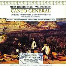 Canto General, an oratorio for two voices, mixed choir and orchestra by Mikis Theodorakis based on poems from Canto General by Pablo Neruda was recorded live on August 13, 1975, at the Karaiskakis-Stadium, Pireus and on August 16, 1975, at the Panathinaikos-Stadium, Athens.