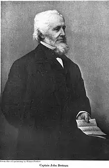 Bertram's first job was a cabin boy and later a commander, ship owner and investor. He was extensively involved in shipping around the world including to Zanzibar, South America, and California and later he invested in railroads. He retired from actively commanding boats at age thirty-six. Later in life Bertram donated an "Old Men's Home," and helped to create Salem Hospital. John Bertram donated scholarship money to several Bates College students he met working at a hotel in New Hampshire, and his daughter Clara Bertram Kimball donated further funds to the college after his death, and Bates named a building "John Bertram Hall" in his honor.[2] Bertram died in 1882.[3]