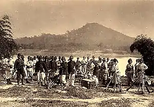Marine artillerymen and Turcos of Brière de l'Isle's 1st Brigade at a halt on the Clear River during the march to Hưng Hóa, April 1884
