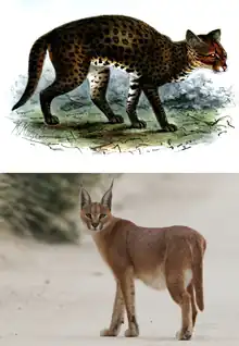 Caracal is a genus in the subfamily Felinae of the family Felidae. It was proposed by John Edward Gray in 1843 who described a skin from the Cape of Good Hope in the collection of the Natural History Museum, London.[1] Historically, it was considered to be a monotypic genus, consisting of only the type species: the caracal C. caracal.[2]