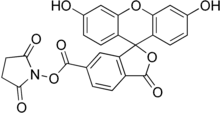 Carboxyfluorescein succinimidyl ester (CFSE) is a fluorescent cell staining dye. CFSE is cell permeable and covalently couples, via its succinimidyl group, to intracellular molecules,[1] notably, to intracellular lysine residues and other amine sources. Due to this covalent coupling reaction, fluorescent CFSE can be retained within cells for extremely long periods. Also, due to this stable linkage, once incorporated within cells, the dye is not transferred to adjacent cells.