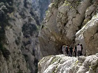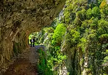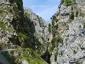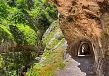 The Cares Trail runs in between the Cantabrian Mountains and is referred to as the "Divine Gorge" of the Cares river, It is a pathway at mid-height of approximately 11 kilometers in length. It is considered one of the most beautiful natural sites in Spain, it runs along caves, bridges and pathways sculpted in the rock.[1][2]
