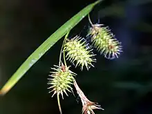 Carex hystericina is a species of sedge known by the common names bottlebrush sedge and porcupine sedge. It is native to much of North America including most of southern Canada and most of the United States. It grows in wet habitat such as wetlands and riverbanks, especially on calcareous soils. In the right conditions it can become very abundant and even weedy. This sedge produces dense or loose clumps of triangular stems up to a meter tall from short rhizomes. The inflorescence is several centimeters long and is accompanied by a bract which is longer than the spikes. The fruits are coated in perigynia with pointed, toothed tips. It is highly recommend for sedge meadow restorations.