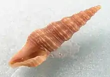 The slender, fusiform shell is light brown with whitish nodules. It contains 11 whorls, slowly increasing. The two apical whorls are smooth, forming a large rounded protoconch. The following whorls are longitudinally obliquely costate. The ribs are most prominent at the middle of the whorls, where they are crossed by two spiral lines, which form transversely elongate nodules upon them. A wavy carina passes along the upper margin of the whorls, and a finer thread borders the lower suture. On the body whorl, the ribs are produced downwards below the middle but do not extend quite to the end of the rostrum. The spirals number about eighteen, and about seven of the upper ones are more or less nodulous on crossing the ribs; the rest below are finer and smooth. Between the nodulous lirae, both on the spire and on the body whorl, there are fine threadlike lines, and the whole surface exhibits delicate wavy growth-striae. The aperture is brown within, not quite one-third the length of the shell. The outer lip is thin at the edge, distinctly sinuate below the sutural keel, and has a rib or varix, larger than the other ribs on the outside. The columella is straightish, covered with a pale callus formed into a tubercle at the sinus.[2]