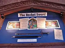 Carlisle Cathedral has a fine set of 46 carved wooden choir stalls with misericords, which were installed in the early 15th century.[2][3] Misericords are hinged seats, "constructed to keep the monks from falling asleep while at prayers",[10] and carved with numerous figures and creatures. Despite their purpose, the "pillars supporting the canopies bear traces of having been burnt, by weary monks who dropped off to sleep in the midst of their interminable devotions while holding a lighted candle in their hands."[11] The misericords were made out of black oak, and their backs carved with scenes of the legends of St. Anthony the Hermit, St. Cuthbert, St. Augustine, and the twelve apostles, as well as mythical themes. The misericords of Carlisle include typical iconography of "half-length angels, beasts deriving from the Bestiary, hybrid creatures, and narrative scenes, including the inverted world theme of the Woman beating a Man that no decent set of misericords could be without."