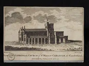 In the 15th and early 16th centuries, the monastic buildings were renewed.[2][5] With the Dissolution of the Monasteries from 1536, and the establishment by Henry VIII of the Church of England as the country's official church, the Dominican and Franciscan friaries were dissolved and Carlisle cathedral was run by a secular chapter like the cathedrals at Lincoln and York, which practice has continued to this day.[6] During the time of the English Civil War, a portion of the nave of the cathedral was demolished by the Scottish Presbyterian Army in order to use the stone to reinforce Carlisle Castle. Between 1853 and 1870 Carlisle Cathedral was restored by Ewan Christian. In the early 19th century, the cathedral became the subject for a geometric analysis by Robert William Billings.[7]