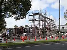 ![]() Carlton Hotel in scaffolding for repairs of 2010 Canterbury earthquake damage, but with significant new damage visible from the February 2011 Christchurch earthquake | |