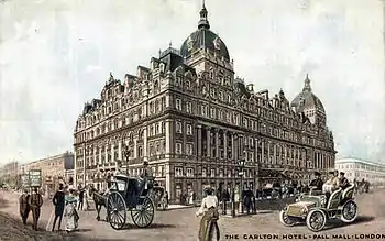 When building work began, César Ritz and Auguste Escoffier were employed by Richard D'Oyly Carte as manager and chef de cuisine respectively at the Savoy Hotel. They were already planning to set up independently, and had established the Ritz Hotel Development Company, when Carte dismissed them both in 1897 for financial irregularities.[2] After successfully opening the Hôtel Ritz in Paris the following year, Ritz agreed to take a 72-year Crown lease of the new hotel in London.[1] A limited company, The Carlton Hotel, Limited, was formed. The name Carlton comes from Carlton House, the nearby former home of the Prince Regent. The company's prospectus stated: