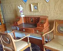The desk resembles a normal writing table, but small drawers above the surface form a "U" shape around the user, instead of merely facing the user as in a typical bureau à gradin. Unlike other types of bureau à gradin, the Carlton House desk usually offers no pigeonholes. There are usually small slopes over each of the desktop drawers at the left and right ends of the "U" shape. Drawings of this type of desk were presented by Hepplewhite in his noted design book, the Cabinet-Maker and Upholsterer's Guide, and by Thomas Sheraton in his own book of designs, The Cabinet Maker and Upholsterer's Drawing Book, thus ensuring its popularity.[1]