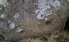 Ardestie earthhouse was discovered in the 1940s to the north of Mains of Ardestie farm.[1] It was excavated in 1949-1950 by F.T. Wainwright, who first suggested that the function of the souterrain was as an underground cow byre, although grain storage and ritual use have also been suggested.[2] Incorporated into the structure are recycled stones with neolithic/Bronze Age cup and ring marks