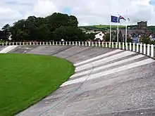 The velodrome is 405.38 metres long,[1] and is the centre piece of Carmarthen Park. Officially opened on Easter Monday in 1900,[2] it has been in continuous use ever since, and is believed to be the oldest outdoor concrete velodrome in continuous use in the world. Here the concept of 'pacing' was first introduced, whereby each cyclist achieves higher speeds by racing in the slipstream of a motor cyclist.[3]