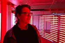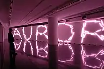 Gross is known for her art installations that feature neon. A recent exhibition, for example, featured Figurantes/Extras, which focused on the apotheosis of war with its procession of doubtful figures.[9] The figures included those listed by Karl Marx in The Eighteenth Brumaire of Louis Napoleon such as people without ambition, decadent ruffians, con men, and pickpockets, among others.[10] She is also noted for her drawing, paintings, lithography, stamps, photocopies and video art.[4] Early in her artistic career, she focused on productions exhibited in public spaces (e.g. Escada-Escola) and these often involved proposition of plastic activities for children as well as themes that explore education.[11] Her art productions that use plastic also often articulate a critical look at the social and political dimensions of the modern urban landscape.