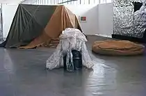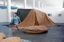 Gross career began during a period of social upheaval in Brazil. Her contemporaries had to contend with state censorship and violence perpetrated by series of dictatorial regimes that began in 1964. Gross participated in collective movements that used public space as artistic platforms. Among the exhibitions she participated in during this period were the Art in Square Movement and Bandeiras na Praça.[7] During the 1969 Bienal, she also exhibited a large metallic sculpture covered by a tarpaulin. This art production called A carga ("Cargo") did not only focus on the sculptures but also the connotation of threat and danger.[5] Notable pieces in this exhibition include Presunto ("Ham") and Barril ("Barrel"), which explored the urban landscape characterized by ambivalence between opacity and morbidity.[5] In 1977, she produced a video featuring a black gouache composed of images depicted on the screen orthogonally, connoting a prison.[8]