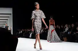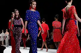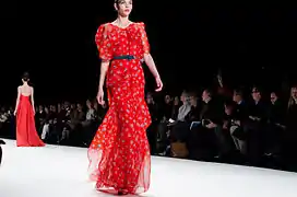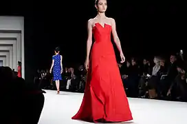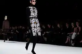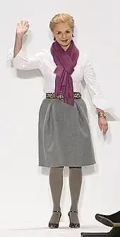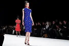 In 1965, Herrera began her career working as a publicist for Emilio Pucci, a Florentine Marquis himself and a close family friend. She began working at Pucci's Caracas boutique, and moved to New York in 1980.[10] Frequently associating with Mick and Bianca Jagger and Andy Warhol, at Studio 54, she became well known for her dramatic style. She first appeared on the International Best Dressed List in 1972, then was elected to its Hall of Fame in 1980.[9] In 1981, her friend Diana Vreeland, then Editor-in-Chief of Vogue suggested that Carolina design a clothing line. She did so, having samples made in Caracas, and debuted her collection at Manhattan's Metropolitan Club to critical acclaim.[11] A well known Park Avenue boutique, Martha's, agreed to showcase her clothing in their prominent windows. Upon this initial success, she returned to Caracas and raised capital to fund a more formal launch. Her first runway show in 1980 included future supermodel Iman.[9] Carolina Herrera presents her Ready-to-Wear Collection semiannually at Mercedes-Benz Fashion Week in New York.[12][13]