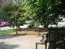 In Romania the carpet hanger (bara de bătut covoare or bătător de covoare) was an important landmark in the social life of each neighbourhood during the communist and post-communist period, where it served as a meeting point for neighbours and was frequently used in children's games.[6] Before important holidays, queues would form around the railing, as few people owned a vacuum cleaner, and even those who did would still beat their carpets in order to 'freshen them up'.[7] During the rest of the year, "it was generally used as a football goal by the boys, while it suddenly transformed girls into Nadia Comăneci."[7]
