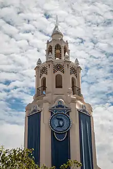 The exterior design was in the Spanish Colonial Revival style, with whitewashed concrete trimmed in blue, with a high bell tower and neon sign visible for miles.[4] The architects were Carleton Winslow and Dwight Gibbs.[6] The iconic octagonal tower was placed in the front corner spandrel space left between the circle and the square. The auditorium's cylinder-shaped wall was raised up above the roof line, to create a parapet visible from the outside that resembled a circus tent. "Simple, massive and dignified, the building stands out for its intrinsic beauty," raved The Architect and Engineer. Pacific Coast Architect wrote that it was a theatre "masked as a cathedral".[4]