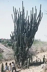 The gaps between these posts were densely woven with branches, approximately 2.5 centimetres (0.98 in) thick, without any additional attachments.[1] The main types of wood used for this purpose are the mata di Mangel or mangrove trees (Laguncularia racemosa) but kwihi wood was also utilized.[9] Aruba has four types of mangrove trees: Mangel tam (Rhizophora mangel ), Mangel preto (Avicennia germinans), Mangel shimaron (Laguncularia racemosa), and Fofoti (Conocarpus erectus).[10] These mangroves account for less than 2% of Aruba's overall vegetation and have been a protected plant species.[11] 26 July is recognized as International Day of Mangrove Trees.[12]