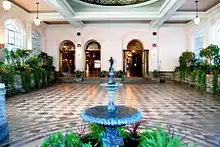 Other rooms in Casa Loma include The Conservatory, a room that showcases plant life. The Conservatory also includes a fountain at one end of the room. The Round Room is designed to fit beneath the mansion's tower; this room is notable for its doors and windows, which curve to follow the shape of the room.